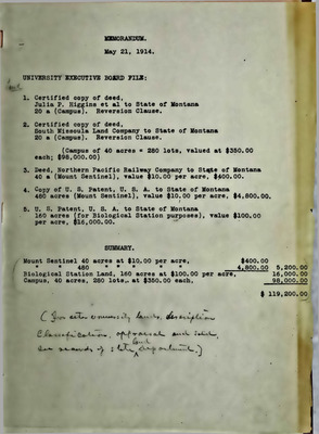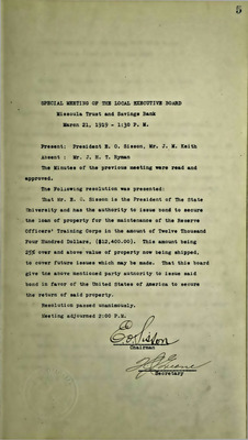 These ledgers contain the meeting minutes of the University Local Executive Board, a governing body of the University of Montana in Missoula. The Local Executive Board was a part of the legislature put in place by Governor Edwin L Norris in 1909 to restructure the higher education governance of the four schools in the State. For each university, the Executive Board was led by the university President as chairman and two prominent leaders from the surrounding community who were officially appointed and confirmed by the Governor and State Board, respectively. The Executive Board was beholden to the State Board and committees and discussed topics such as campus grounds and maintenance, curriculum, personnel, student funds, and university finances. The three volumes (I-III) cover the years 1909-1913, 1912-1919, and 1919-1943 with J. B. Speer serving as secretary, spanning the university presidencies of Clyde Duniway, Edwin Craighead, E. O. Sisson, Charles H. Clapp, George F. Simmons, and Ernest O. Melby.